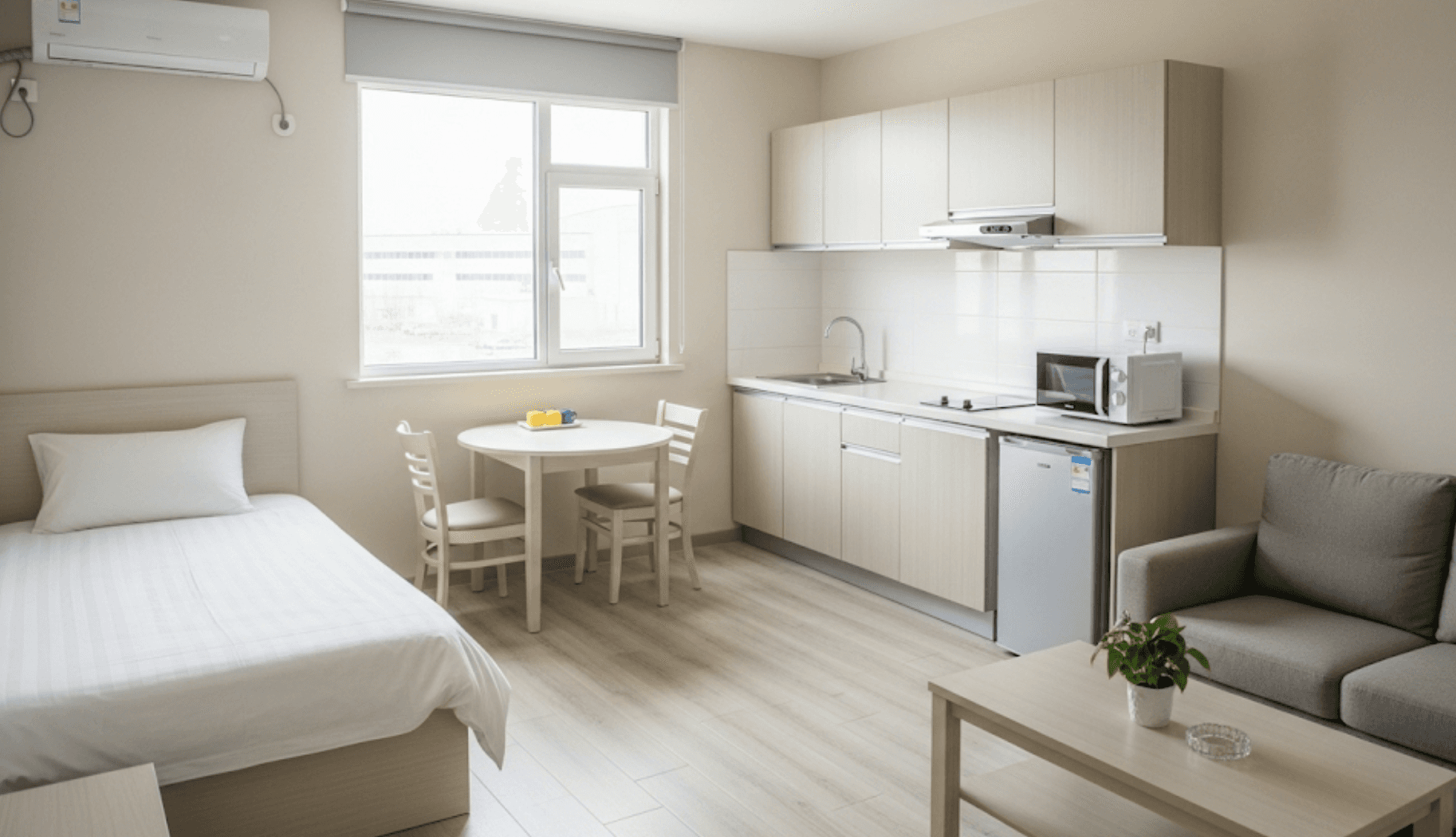 Clean and secure on-campus housing facilities offered to workers, providing a safe and convenient living environment. Units come with a small living area, furniture, and kitchen area.