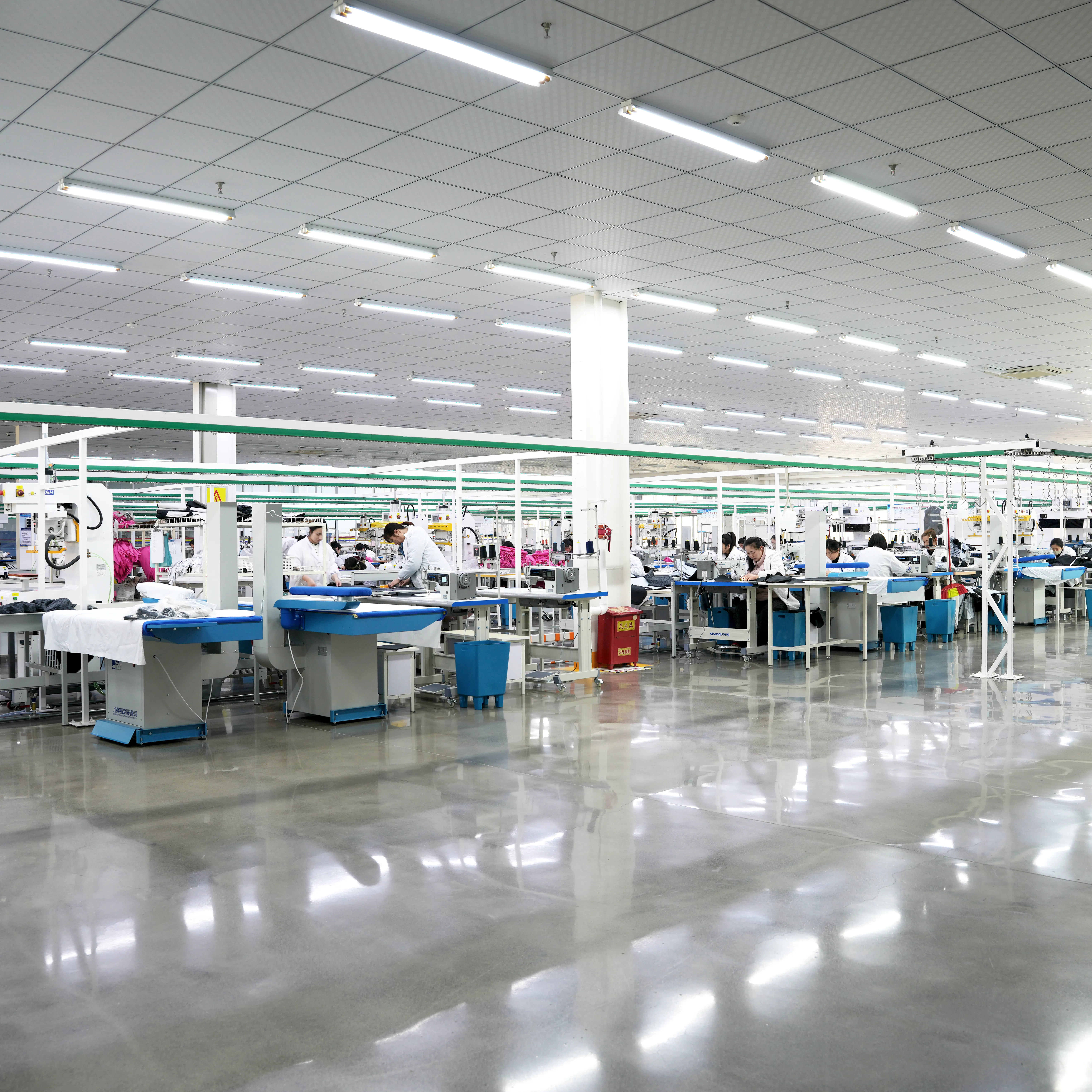 The factory floor is organized into distinct, specialized divisions, each equipped with the specific machinery and expert teams required for different garment categories.